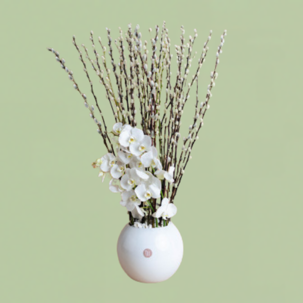 This white vase contains cotton Salix, cut orchids and white stone.