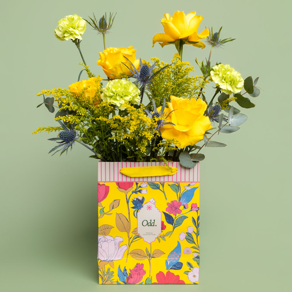 Elevate your floral gifting with this expertly curated arrangement. Our Yellow Petals collection features a sophisticated blend of premium roses, delicate carnations, textured eryngium, and fragrant eucalyptus, all presented in an elegant yellow bag. Each stem is selected for longevity and visual impact, creating a composition that transitions beautifully from vibrant display to dried arrangement. Perfect for celebrations, expressions of gratitude, or adding refined botanical elegance to any space.