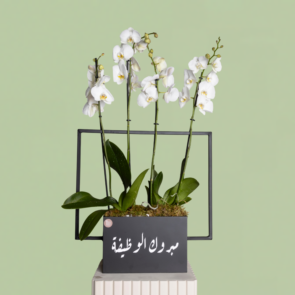 Expertly crafted with elegant white orchids, the Valentina in Black II is a stunning addition to any space. The wooden black box adds a touch of sophistication, while the option for customization allows for a personal touch. Elevate your décor with this beautiful and unique flower arrangement.